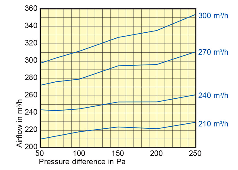 N/A The curves show the flow variations in m³/h of RDR Ø 150, 160 and 200 mm in extraction according to the difference in of pressure in Pascal (pressure range of 50 to 250 Pa). The values given are averages which may vary of 5 % either way. Flow regulators are characterized by their noise level dB(A). |